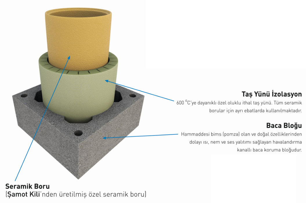 Özel taşyünü izolasyonu sayesinde baca içindeki sıcaklığı muhafaza eder ve dış ortama aktarılmasını engeller.